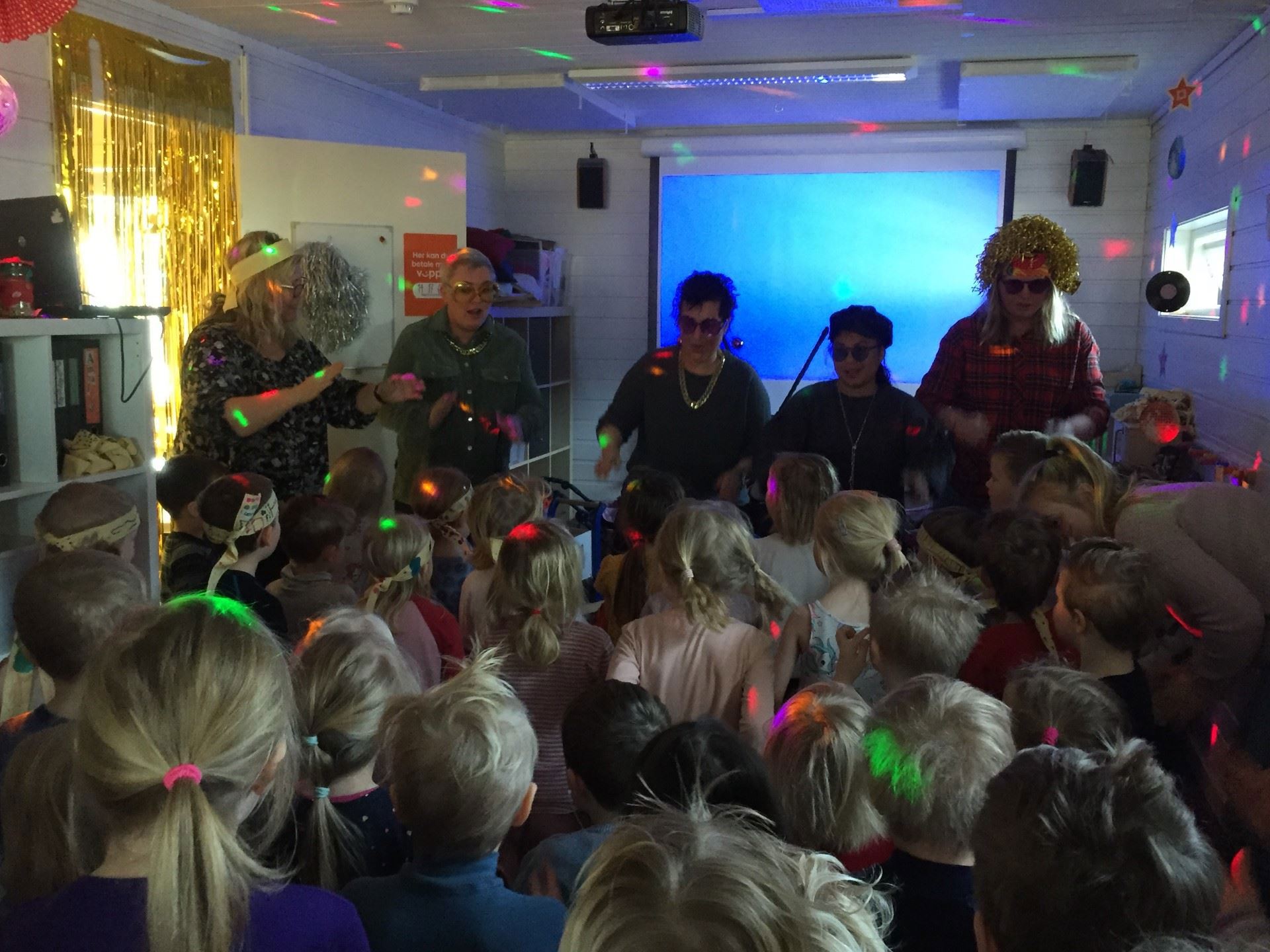 I dag har vi hatt temasamling - 70 tallet. Colargol kom på besøk til oss. Han hadde pynta seg med disco klær, og var klar for å lage disco sammen med oss. Vi måtte jo pynte oss med gele i håret, og selvlagde pannebånd. Vi rocka til "Daddy Cool","We will rock you". Vi lærte også en ny dans til "Greased Lightnin`". Kanskje dere foreldre får se denne dansen på temafesten...…..;)