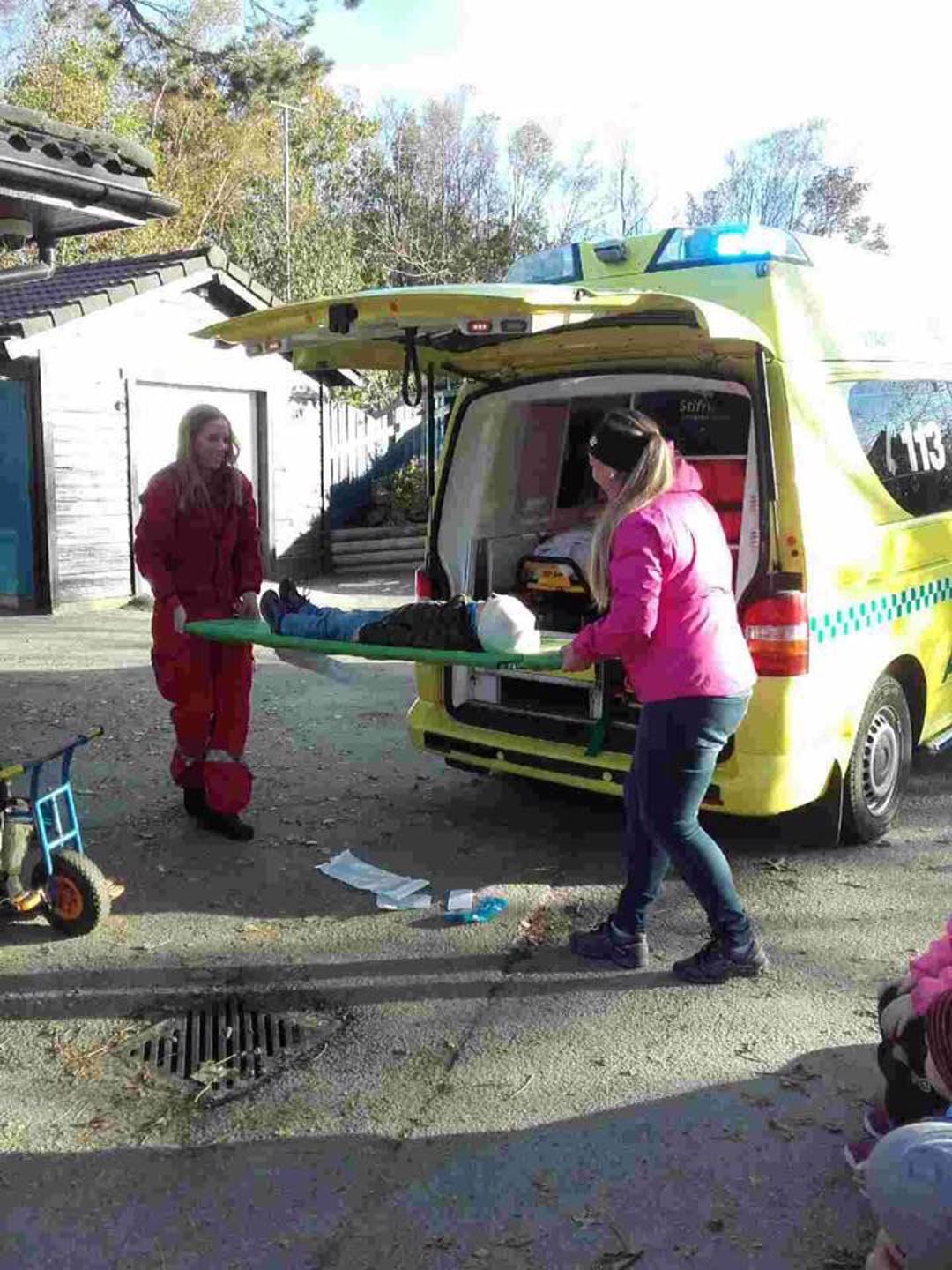 I dag kom ambulansen på besøk til oss i barnehagen:) Vi hadde et rollespill der et sykkelkræsj endte med bandasje på hodet og sykehusbesøk. Alle barna har lært at vi må ringe 113 hvis uhellet er ute! Etterpå fikk de som ville komme inn i ambulansen for å se alt som er inni der!:) Takk for spennende besøk:)
